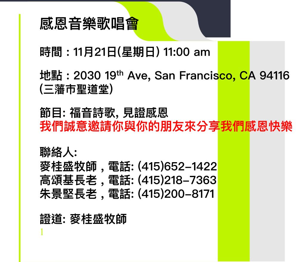 聖道堂 Date: 2021-11-17Author: 三藩市聖道堂 HOLY WORD CHURCH OF SAN FRANCISCO 0 留言 聖道堂將於本星期日, 11/21 上午 11 時, 舉行音樂佈道会,请代祷及邀請親友參加。 分享此文: 分享到 Facebook(在新視窗中開啟) Facebook 分享到 X(在新視窗中開啟) X 分享到 WhatsApp(在新視窗中開啟) WhatsApp 以電子郵件將連結連送給朋友(在新視窗中開啟) 電子郵件 喜歡 正在載入...